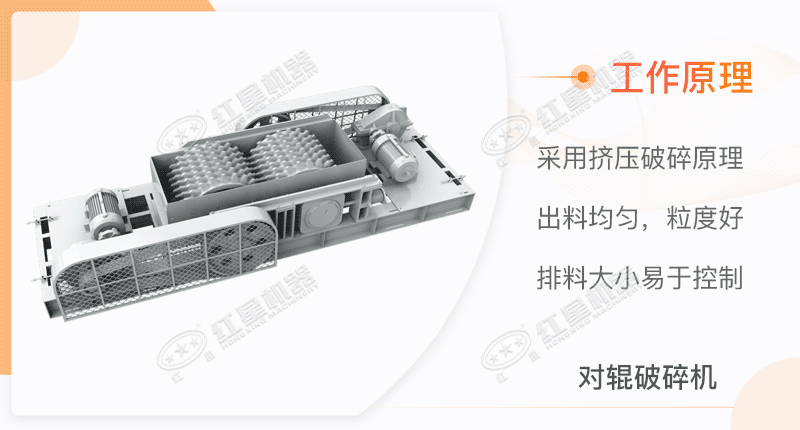 將破碎物料經給料口落入兩輥子之間,進行擠壓破碎,成品物料自然落下。遇有過硬或不可破碎物時,其輥子可憑液壓缸或彈簧的作用自動退讓,使輥子間隙增大,過硬或不可破碎物落下,從而保護機器不受損壞。相向轉動的兩輥子有一定的間隙,改變間隙,即可控制產品排料粒度。